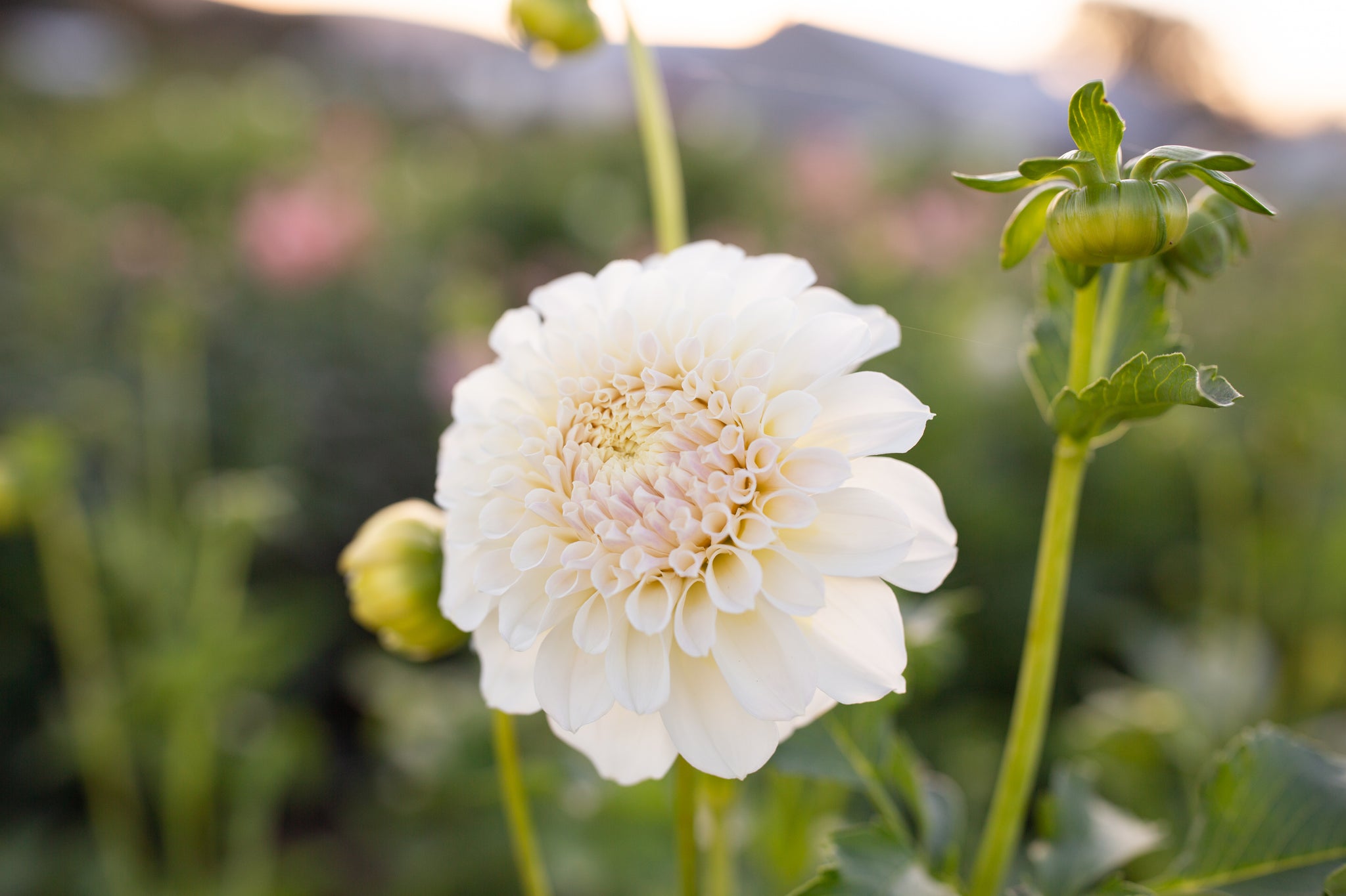 Description: Creamy white dahlia, sometimes with a soft blush center. Beautiful in bouquets!